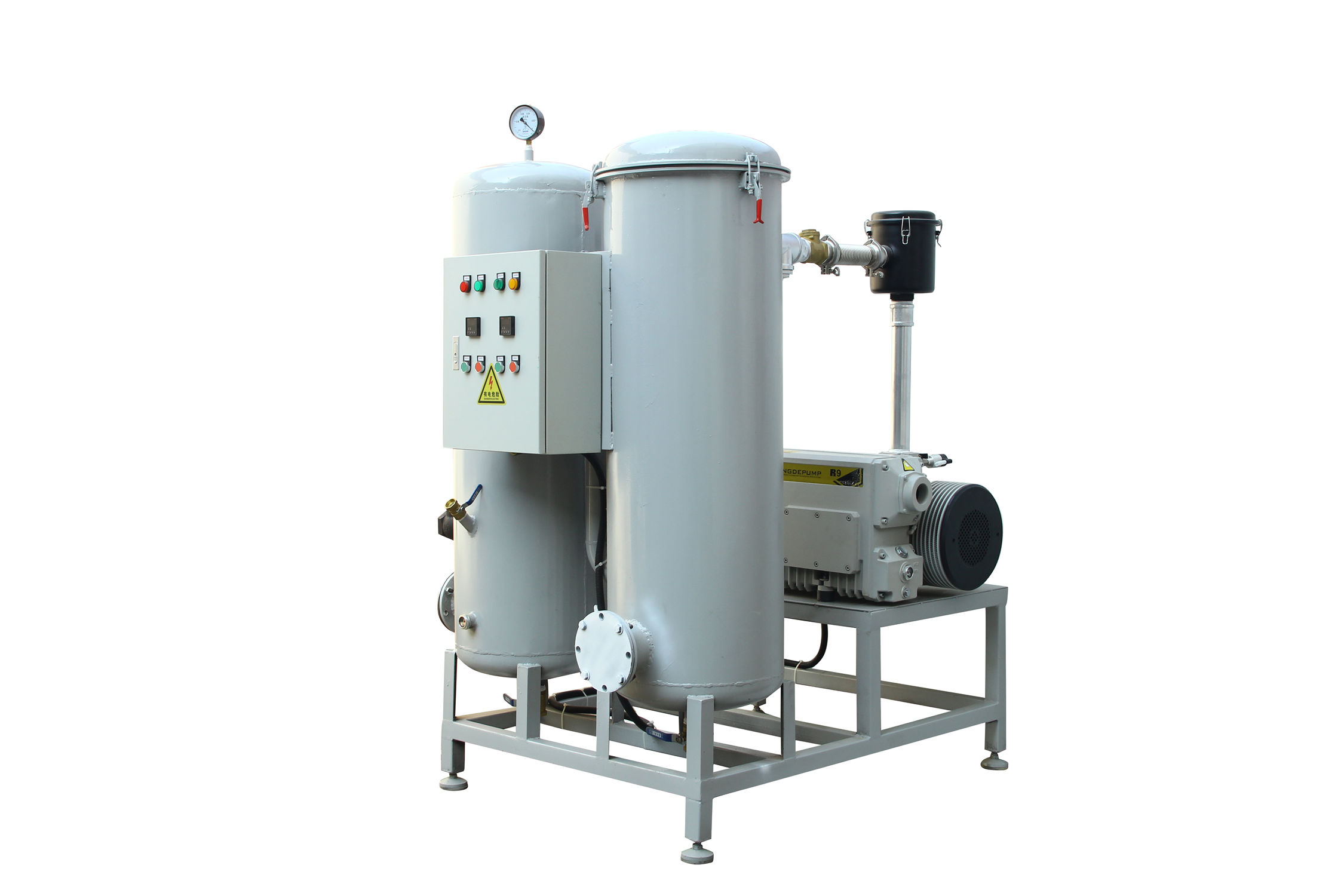 固定式系統一般包括底盤基座、真空泵、真空緩沖罐、控制箱、真空附件(真空閥、真空管道真空過濾器等)、真空度控制系統組成,一般適合抽氣量大,工作條件苛刻等工況例如;3立方真空負壓站,配置2臺302立方真空泵,真空過濾器組,在自動控制模式下瞬間抽氣速度可達上干立方每小時時,遠大于單泵和雙泵直接抽氣的速度。